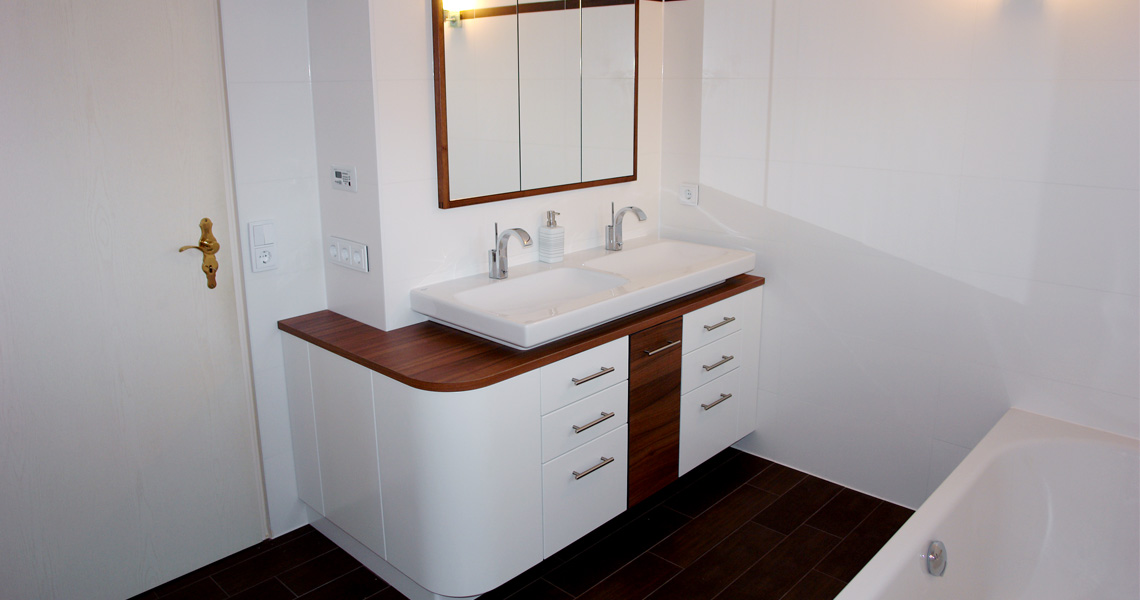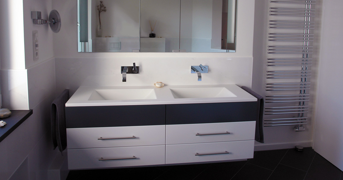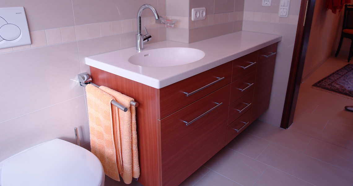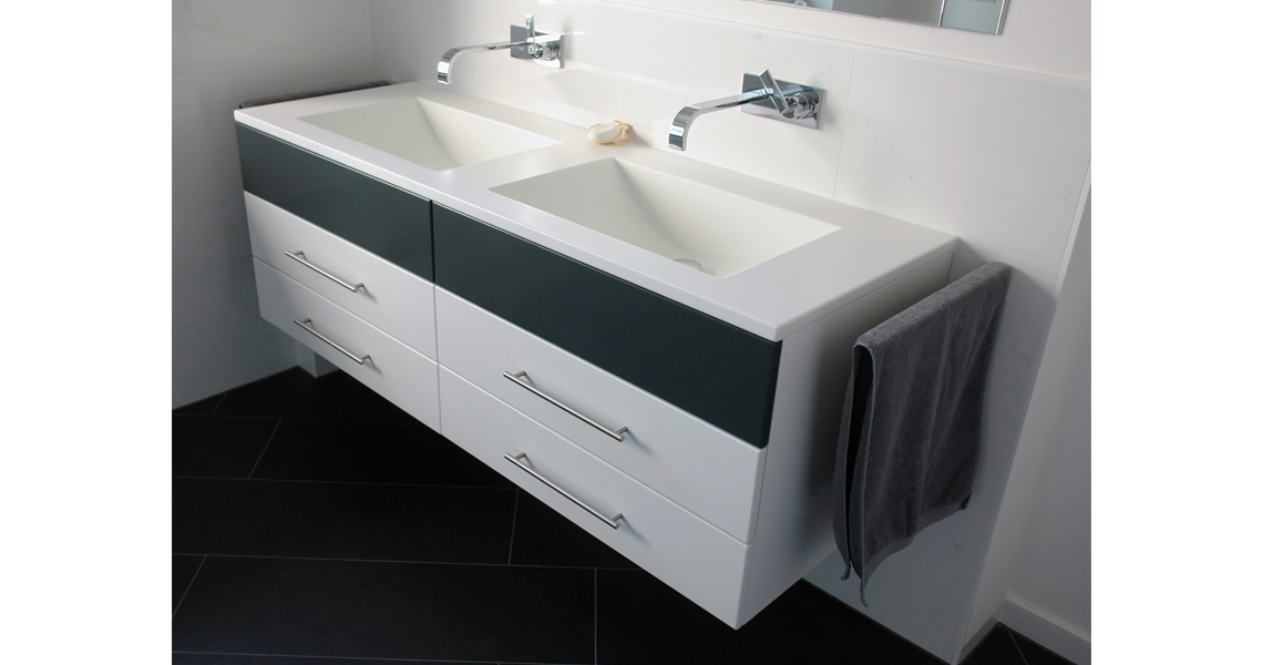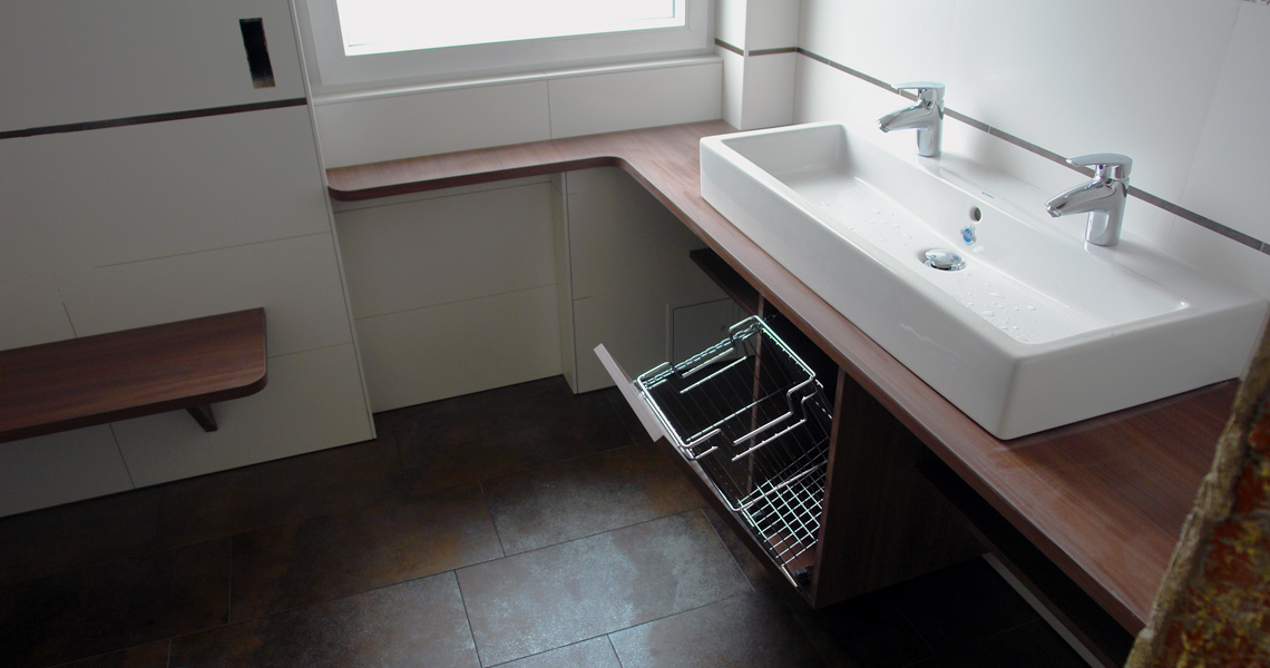 Beste Raumnutzung ist vor allem in Bädern oft essentiell. Für dieses Projekt haben wir uns entschieden den typischen Unterschrank zu modifizieren. Die stark abgerundete Kante bietet mehr Bewegungsfreiheit. Gleichzeitig konnte dadurch die Oberfläche des Waschtisches vergrößert werden, um mehr Ablagefläche zu bieten.