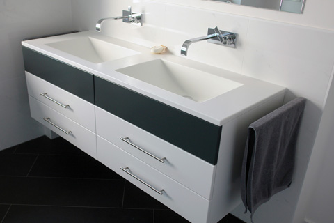 Das passgenaue Waschbecken aus modernem Corian der Firma DuPont bietet eine edle und organisch wirkende Optik. Durch die komplett fugenfreie Verarbeitung ist auch die Reinigung besonders einfach.