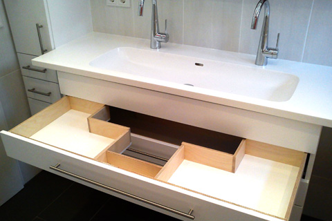 Stauraum im Bad ist oft ein Luxus und gerne wird viel Platz durch die Armaturen und Leitungen belegt. In dieser Individuallösung wurde der Schublade ein Ausschnitt für den Siphon eingebaut um das meiste aus den gegebenen Möglichkeiten zu holen.