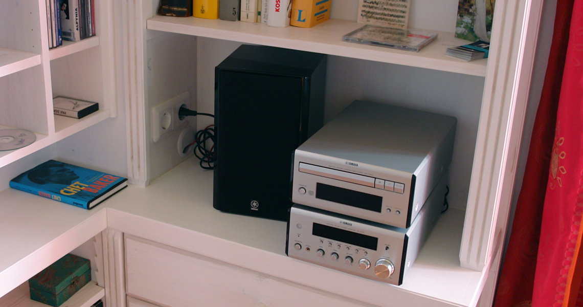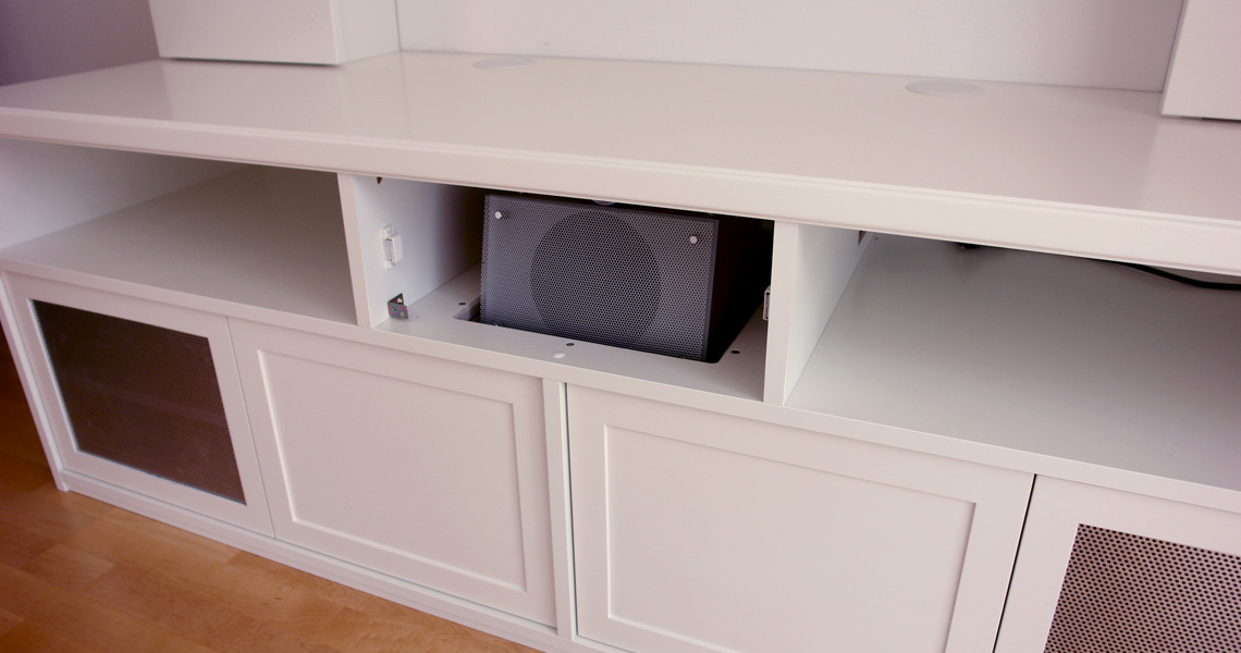 Da es bereits einen eigenen Stil mit den geschwungenen Türbögen besitzt, wurden die Schränke in Höhe und Stil entsprechend angepasst. Zusätzlich wurden Kabelschächte und Steckdosenleisten für die Multimedia-Geräte mit eingebaut.