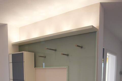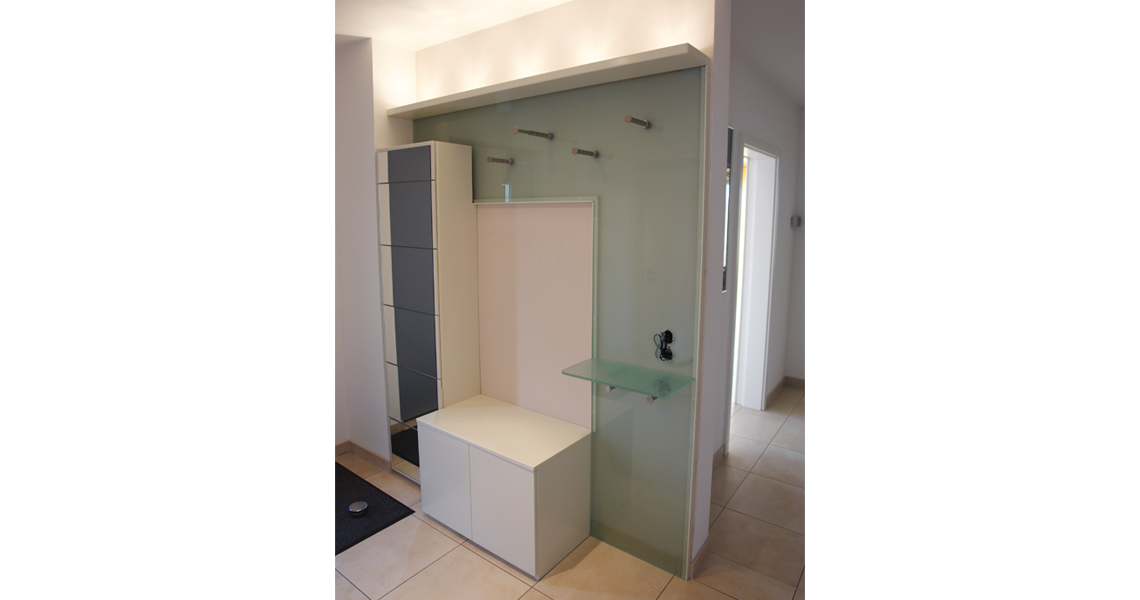 Für diesen stilvollen Eingangsbereich kamen gleich mehrere Techniken zum Einsatz. Die Sitzablage mit Schubläden und der verspiegelte Schuhschrank bekommen durch die satinierte Glasrückwand einen edlen Stil. Die dazu passende Glasablage eignet sich ideal für Telefon. Die indirekte Beleuchtung gibt dem Ganzen den letzten Schliff.