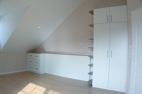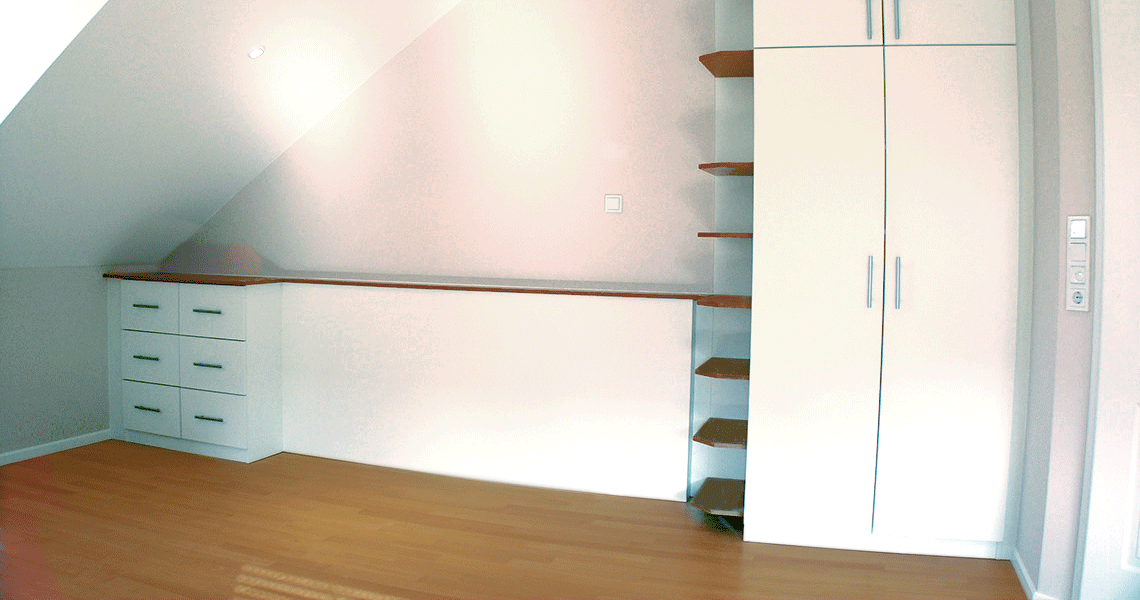 Dachschrägen sind oftmals eine spezielle Herausforderung und benötigen eine individuelle Lösung. In diesem Beispiel wurde zusätzlich eine Schiebetüre verbaut, um weiter kostbaren Platz einzusparen.