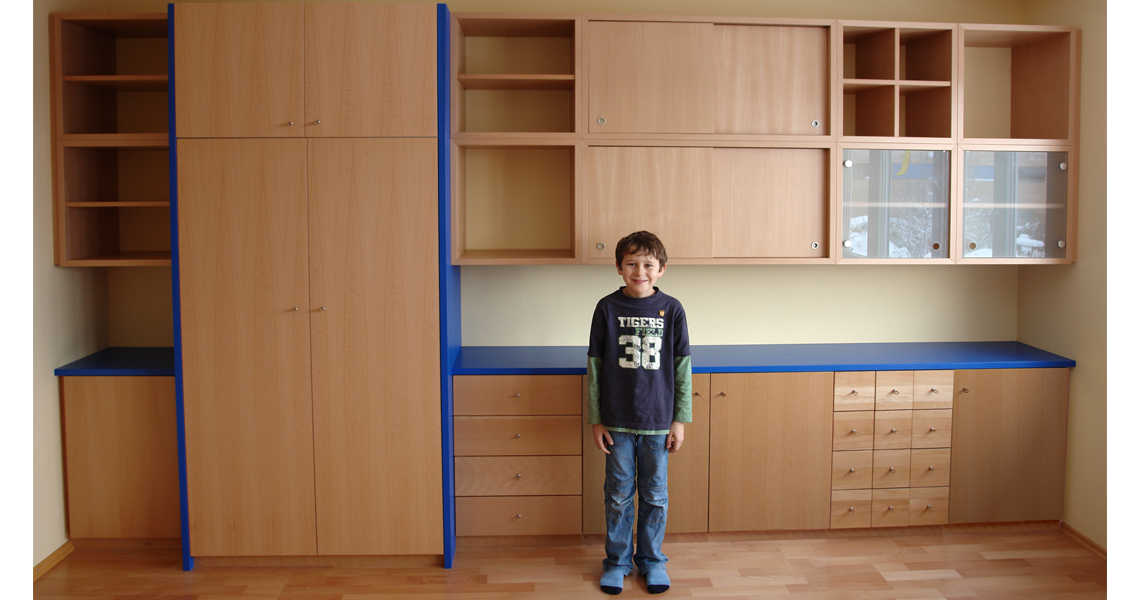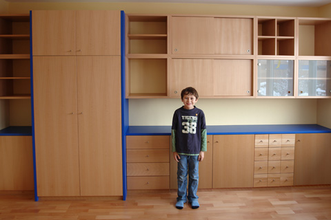 Der stolze Besitzer im Bild war mit seinem neuen Kinderzimmer rundum zufrieden. Von besonderem Interesse waren hier die vielen Schubladen, die genügend Platz aber gleichzeitig auch Ordnung für Spielzeug, Schulsachen und Hobbies bieten.