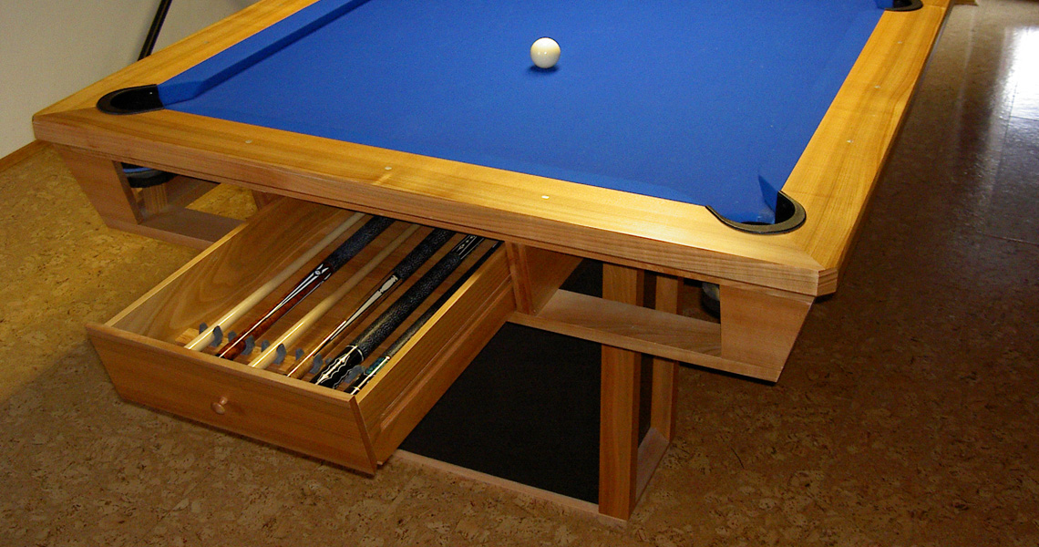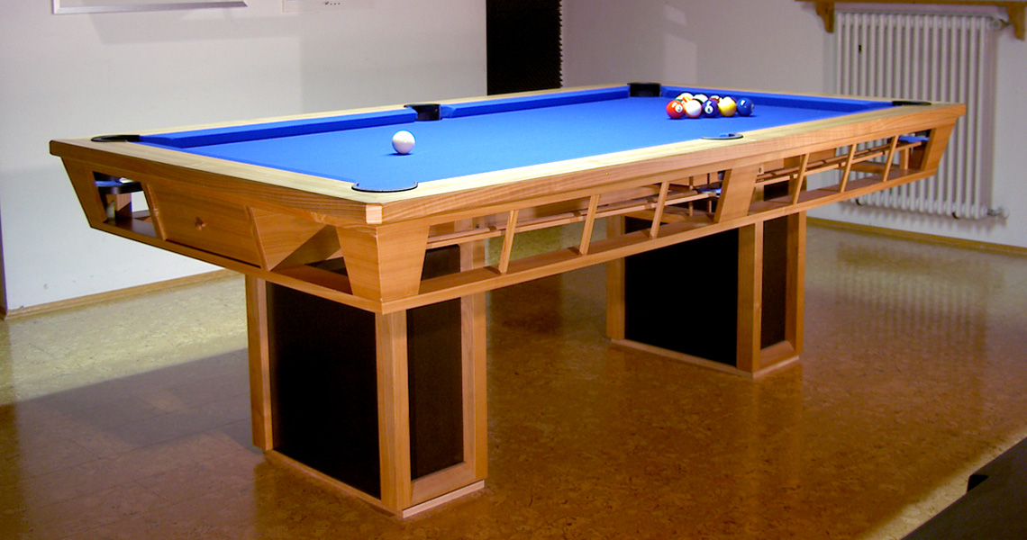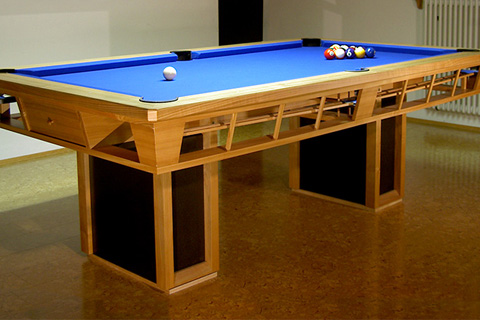 An Extravaganz kaum zu überbieten. Das Meisterstück des Firmengründers Sebastian Bauer ist ein voll funktioneller Billardtisch nach Turnierstandards. Schieferplatte, blauer Bezug sowie Banden wurden speziell für diesen Tisch angefertigt.