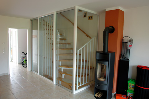 Bonuseffekte: Dank Sicherheitsglas ist für Lärmschutz auch direkt gesorgt und die Wärme des Ofens zieht nicht durchs Treppenhaus nach oben!