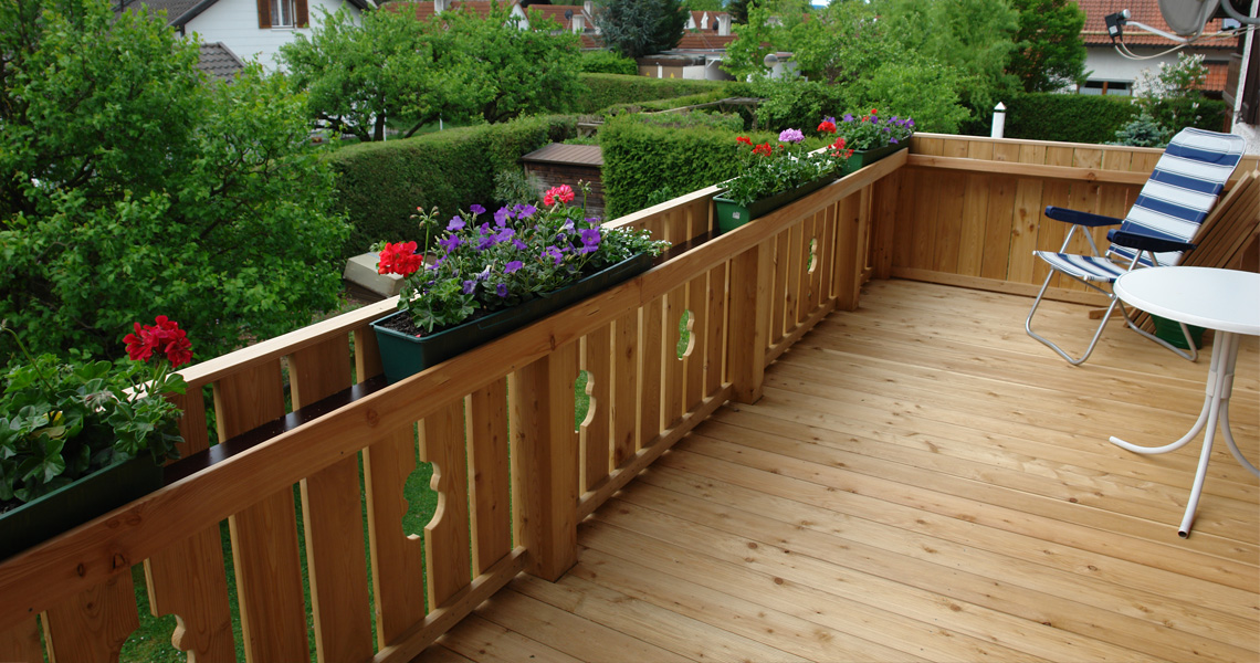 In diesen Vollholzbalkon wurde eine wasserdichte Platte eingelassen um die Terrasse darunter trocken zu halten. Die Bodendielen sind mit einem neuen PVC Wasserableitungssystem verschraubt, wodurch Regenwasser ungehindert auf der wasserdichten Platte abfließen und in einer Regentonne gesammelt werden kann.