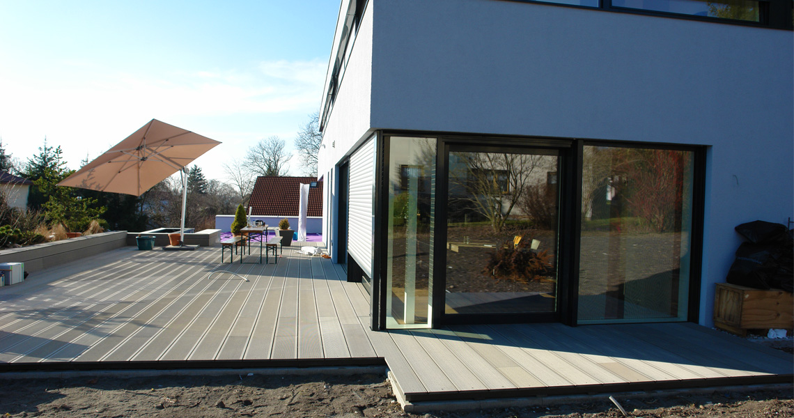 Ein modernes Haus benötigt auch eine moderne Terasse. Bei diesem Neubau mit großem Gartenbereich durfte es daher nicht irgend ein Material sein. Der deutsche Hersteller Megawood (www.megawood.com) bietet genau das richtige: Massive Barfußdielen aus einer Holz-Polymermischung - wiederstandsfähig, kratzfest, wetterfest und pflegeleicht.