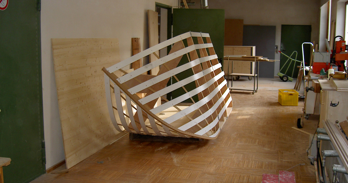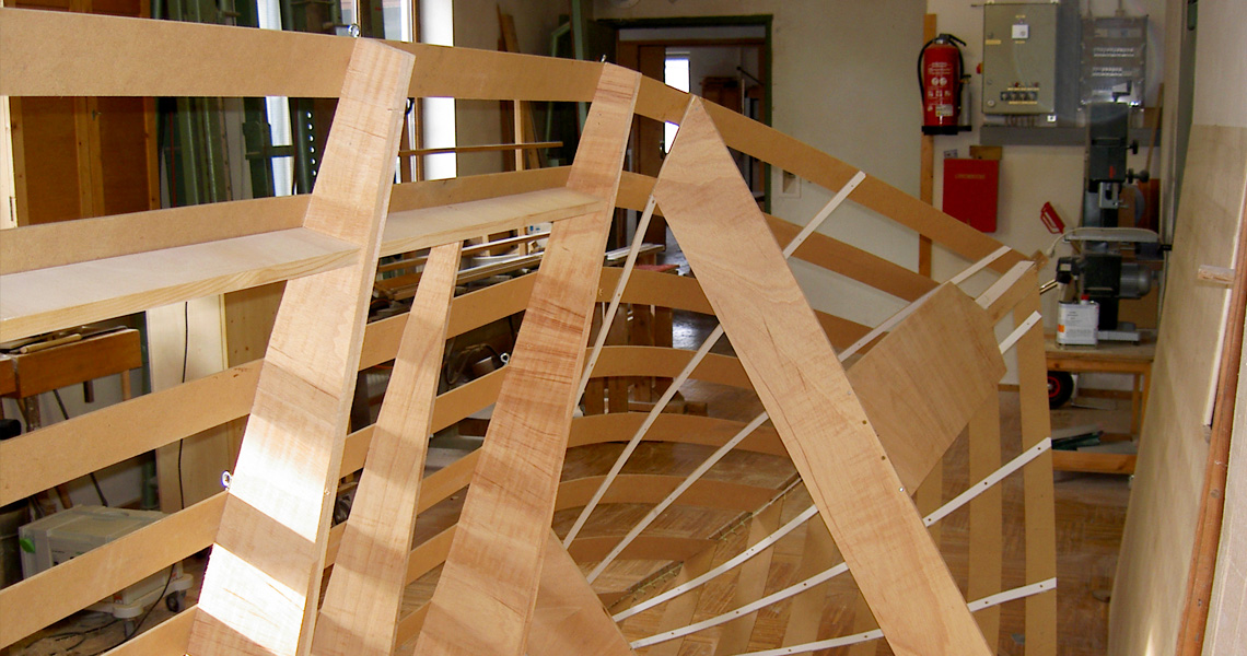 Um diesen Anforderungen gerecht zu werden, schufen wir das hier gezeigte Unterkonstrukt aus dickeren Holzplatten, das von dünneren, gebogenen Platten umspannt wurde. Darüber wurde eine Leinwand gespannt und bemalt.