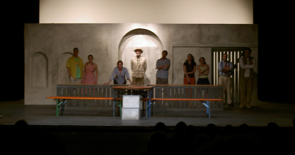 Oder alternativ - ohne eine bemalte Leinwand - können die Schauspieler selbst ins Bild klettern um dem Bühnenbild eine weitere Dimension zu geben.